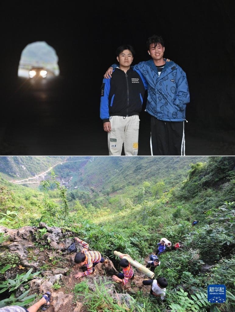 拼版照片:上圖為2023年1月20日,在大化瑤族自治縣板升鄉(xiāng)弄勇村,22歲的蒙宣任(左)和弟弟蒙宣汰站在通往弄勇小學(xué)的隧道旁合影,隧道上方是他們兒時上學(xué)需要攀爬的“天梯”;下圖為2012年9月3日,在大化瑤族自治縣板升鄉(xiāng)弄勇村,蒙宣汰(左一)、蒙宣任(左二)爬山路去學(xué)校。蒙宣任目前在遼寧省交通高等??茖W(xué)校讀書,弟弟蒙宣汰從技校畢業(yè)后在廣東一家汽修廠上班。   新華社記者 黃孝邦 攝