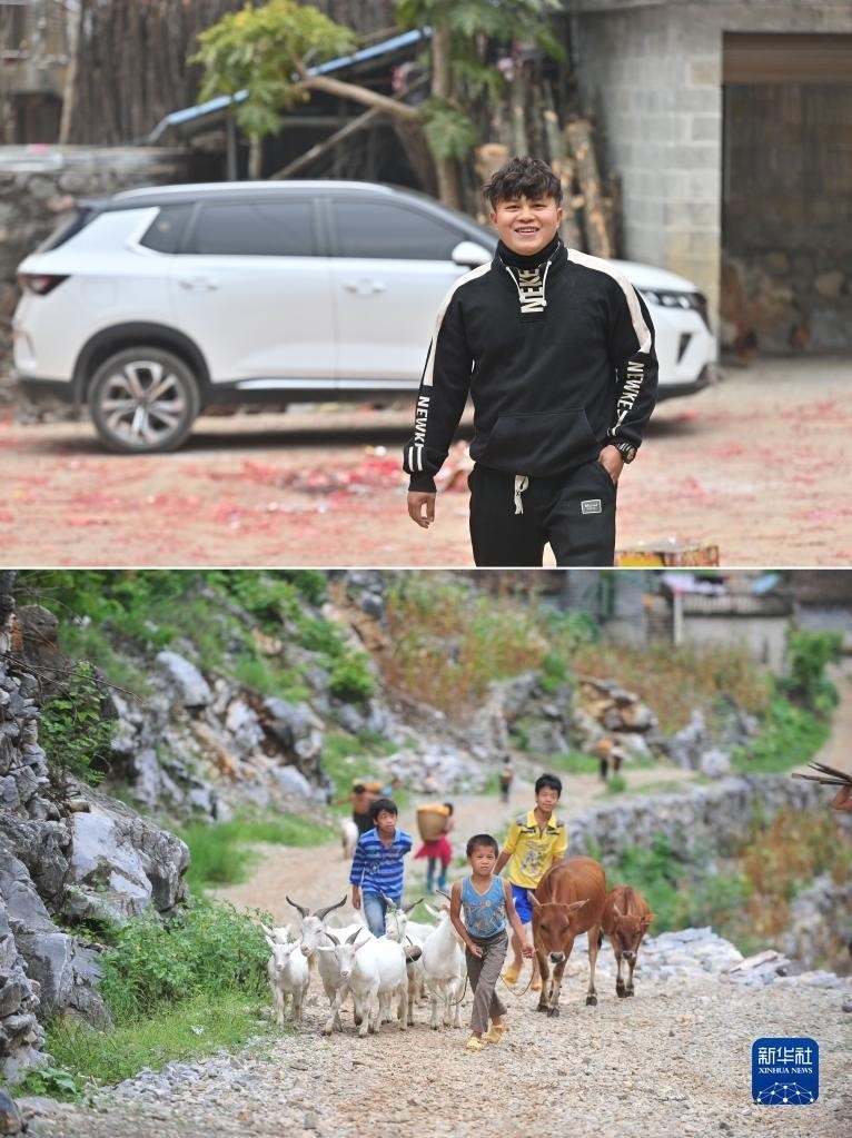 拼版照片:上圖為2023年1月21日,在大化瑤族自治縣板升鄉(xiāng)弄勇村,22歲的蒙宣朝站在自己剛剛購買的汽車前;下圖為2012年7月16日,在大化瑤族自治縣板升鄉(xiāng)弄勇村,11歲的蒙宣朝(前)利用暑假幫家里放牧。技校畢業(yè)后,蒙宣朝到廣東工作。   新華社記者 黃孝邦 攝