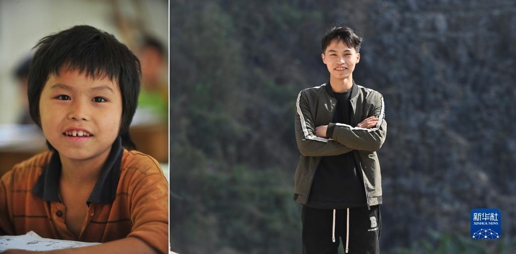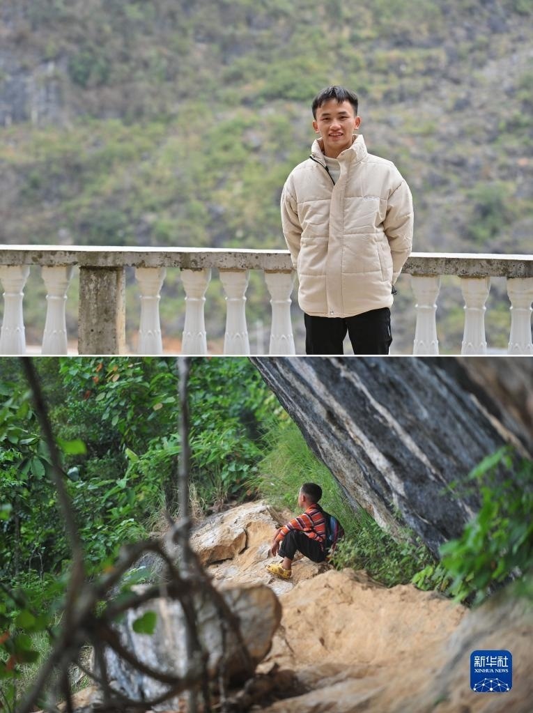 拼版照片:上圖為2023年1月16日,在大化瑤族自治縣板升鄉(xiāng)弄雷村,即將從技校畢業(yè)的蒙科佑站在家門口;下圖為2012年9月5日,在大化瑤族自治縣板升鄉(xiāng)弄雷村,10歲的蒙科佑在上學(xué)途中,坐在懸崖邊上休息。21歲的蒙科佑,希望能掙錢供弟弟妹妹讀書,讓他們接受更好的教育。   新華社記者 黃孝邦 攝