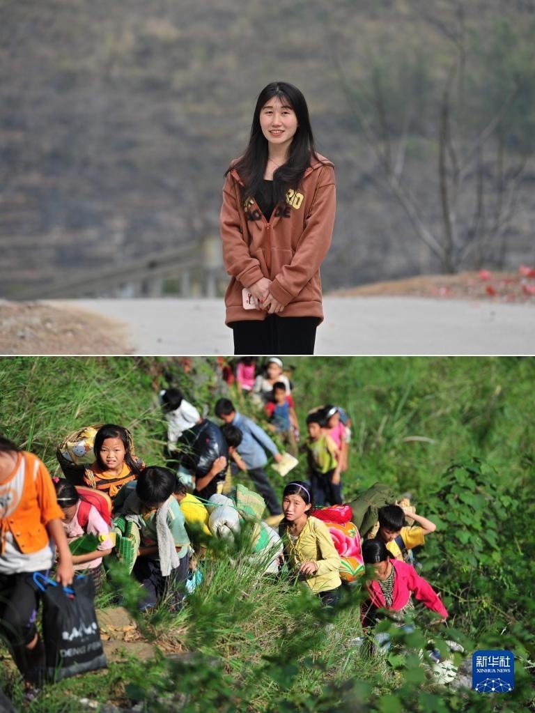 拼版照片:上圖為2023年1月21日,在大化瑤族自治縣板升鄉(xiāng)弄勇村,大專畢業(yè)后在廣州工作的藍秋艷回家過年時在家門口留影;下圖為2012年7月4日,學(xué)校放假后,11歲的藍秋艷(著黃衣者)背著生活用具,走在回家的山路上。22歲的藍秋艷正在努力考取教師資格證。   新華社記者 黃孝邦 攝