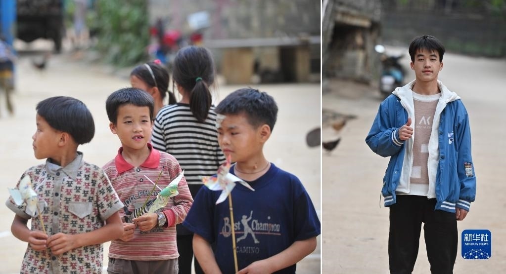 拼版照片:左圖為2012年7月4日,在大化瑤族自治縣板升鄉(xiāng)弄勇小學(xué),7歲的蒙旺兵(左二)在校園里玩風(fēng)車;右圖為2023年1月25日,在大化瑤族自治縣板升鄉(xiāng)弄勇村,正在桂林理工大學(xué)讀大一的蒙旺兵寒假回家時在村中留影?! ⌒氯A社記者 黃孝邦 攝