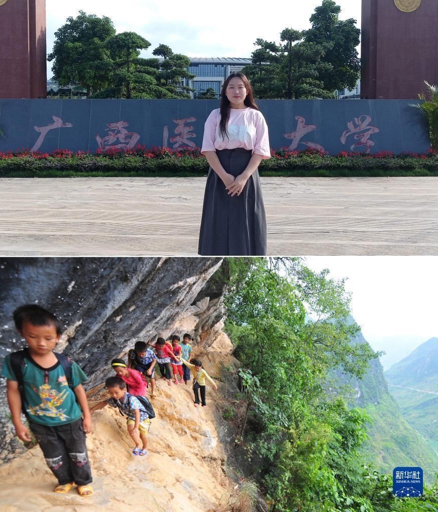 拼版照片:上圖為2023年5月27日,22歲的蒙秋艷站在她就讀的廣西醫(yī)科大學(xué)校門口(新華社發(fā));下圖為2012年9月3日,在大化瑤族自治縣板升鄉(xiāng)弄雷村哈保屯,11歲的蒙秋艷(右一)在懸崖邊護著低年級的小伙伴回家(新華社記者黃孝邦攝)。2021年,蒙秋艷以優(yōu)異的成績,考取廣西醫(yī)科大學(xué)。   新華社發(fā)