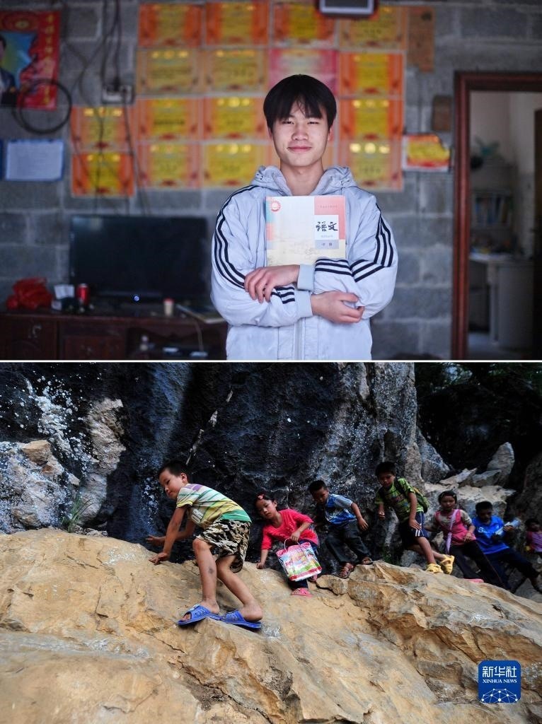 拼版照片:上圖為2023年5月20日,蒙俐谷在大化瑤族自治縣第二中學(xué)高二年級教室里學(xué)習(xí)(新華社記者胡星宇攝);下圖為2012年9月3日,在大化瑤族自治縣板升鄉(xiāng)弄雷村,7歲的蒙俐谷(右一)爬懸崖去學(xué)校讀書(新華社記者黃孝邦攝)。一年后將參加高考的蒙俐谷,希望能考上理想的大學(xué)。