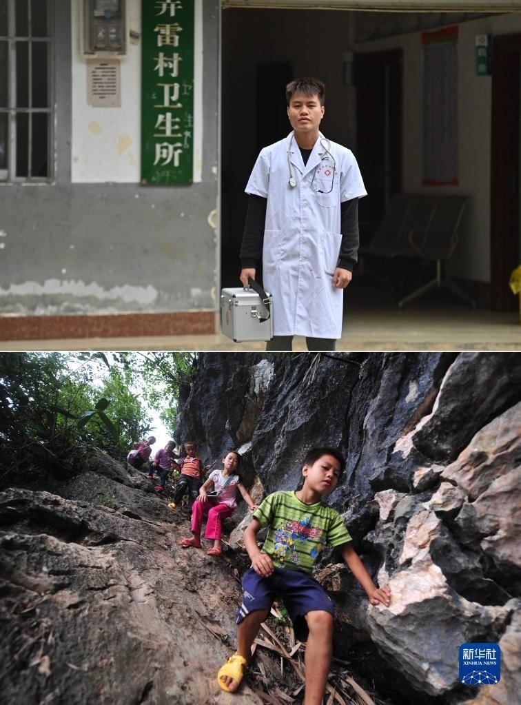 拼版照片:上圖為2023年5月24日,村醫(yī)蒙富松站在大化瑤族自治縣板升鄉(xiāng)弄雷村衛(wèi)生所前(新華社記者胡星宇攝);下圖為2012年9月5日,10歲的蒙富松(右一)爬懸崖去學(xué)校讀書(新華社記者黃孝邦攝)。2021年,蒙富松從衛(wèi)校畢業(yè),回到家鄉(xiāng)成為一名村醫(yī)。   新華社發(fā)