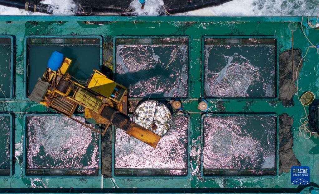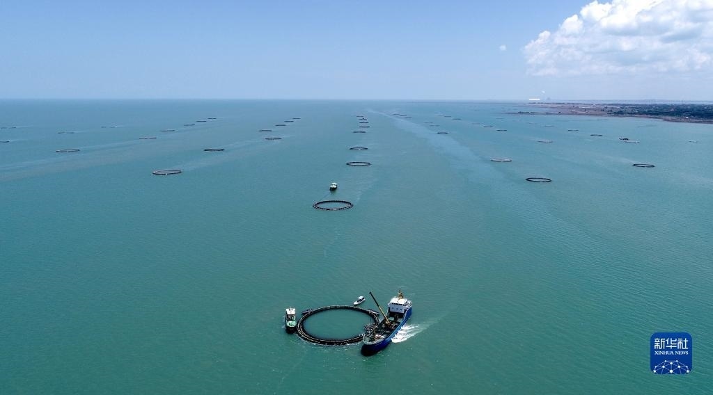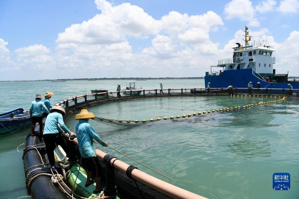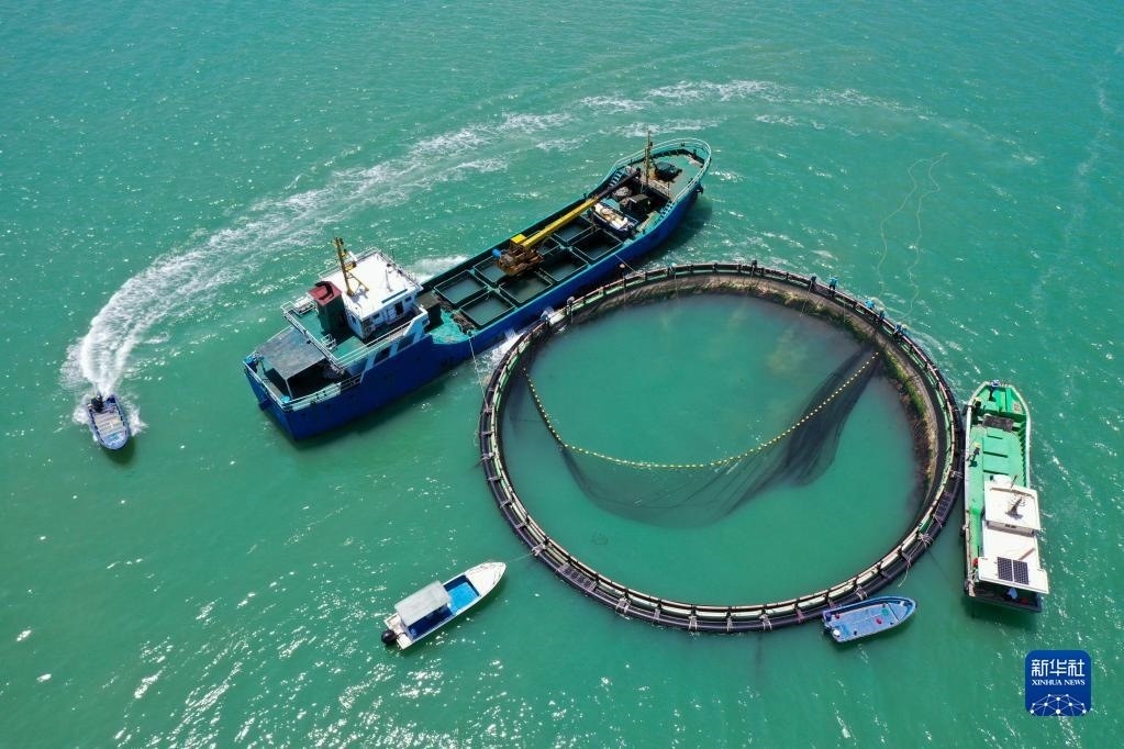 5月27日,在湛江市徐聞縣西連鎮(zhèn),漁業(yè)工人從徐聞國(guó)橋深海養(yǎng)殖有限公司的金鯧魚深海網(wǎng)箱捕魚(無(wú)人機(jī)照片)。