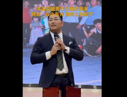 近日,山東臨沂,失去雙腿的男子在高校演講。據(jù)悉,該男子名叫陳州,是世界上第一個(gè)用雙手登頂五岳的人。網(wǎng)友:心中有光,路何止在腳下。