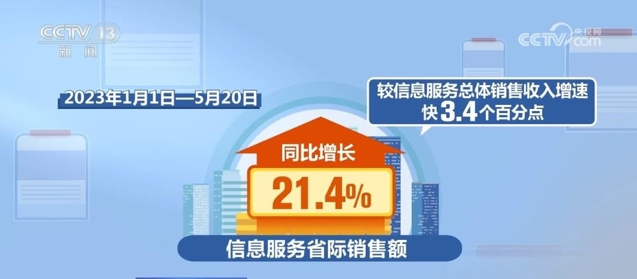 從信息方面來看,2017年—2022年,全國信息服務省際銷售額年均增長22%,較信息服務總體銷售收入增速快2.8個百分點。2023年1月1日—5月20日,信息服務省際銷售額同比增長21.4%,較信息服務總體銷售收入增速快3.4個百分點。