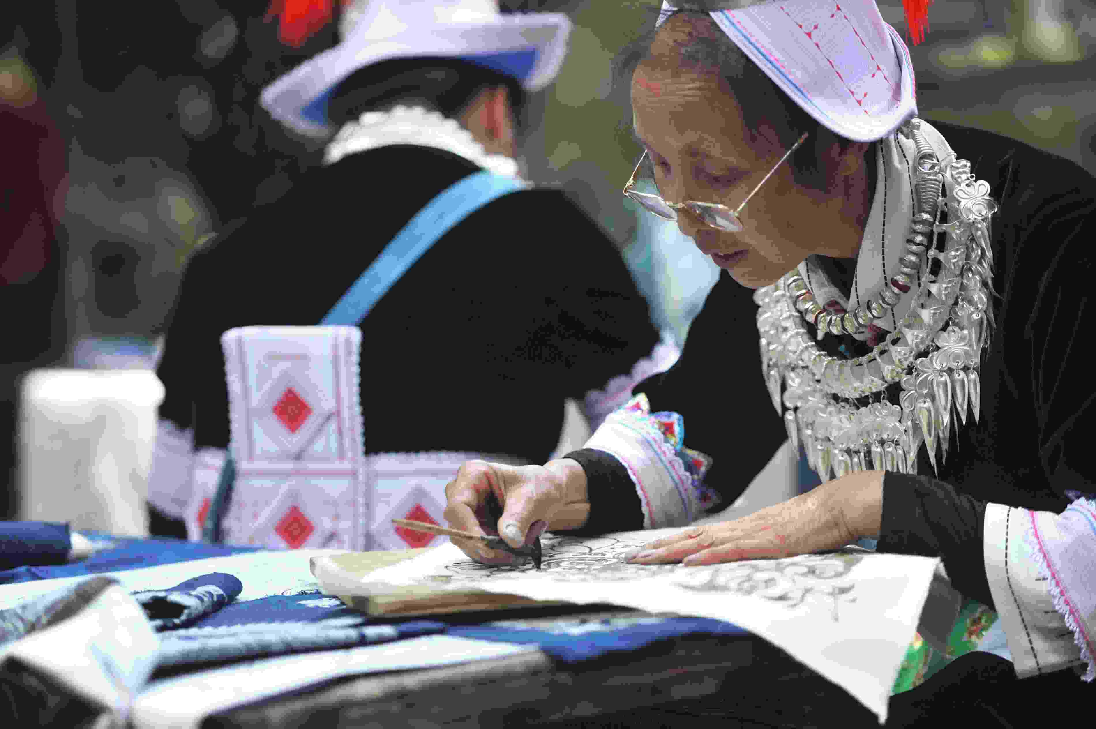 2023年5月26日,民間藝人在貴州省黃平縣飛云崖景區(qū)展示傳統(tǒng)蠟染技藝。 (寧堅 楊忠)
