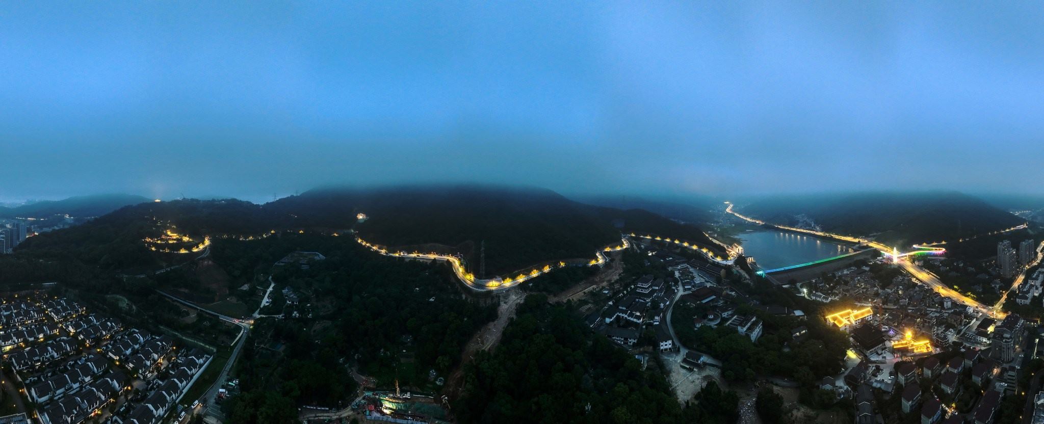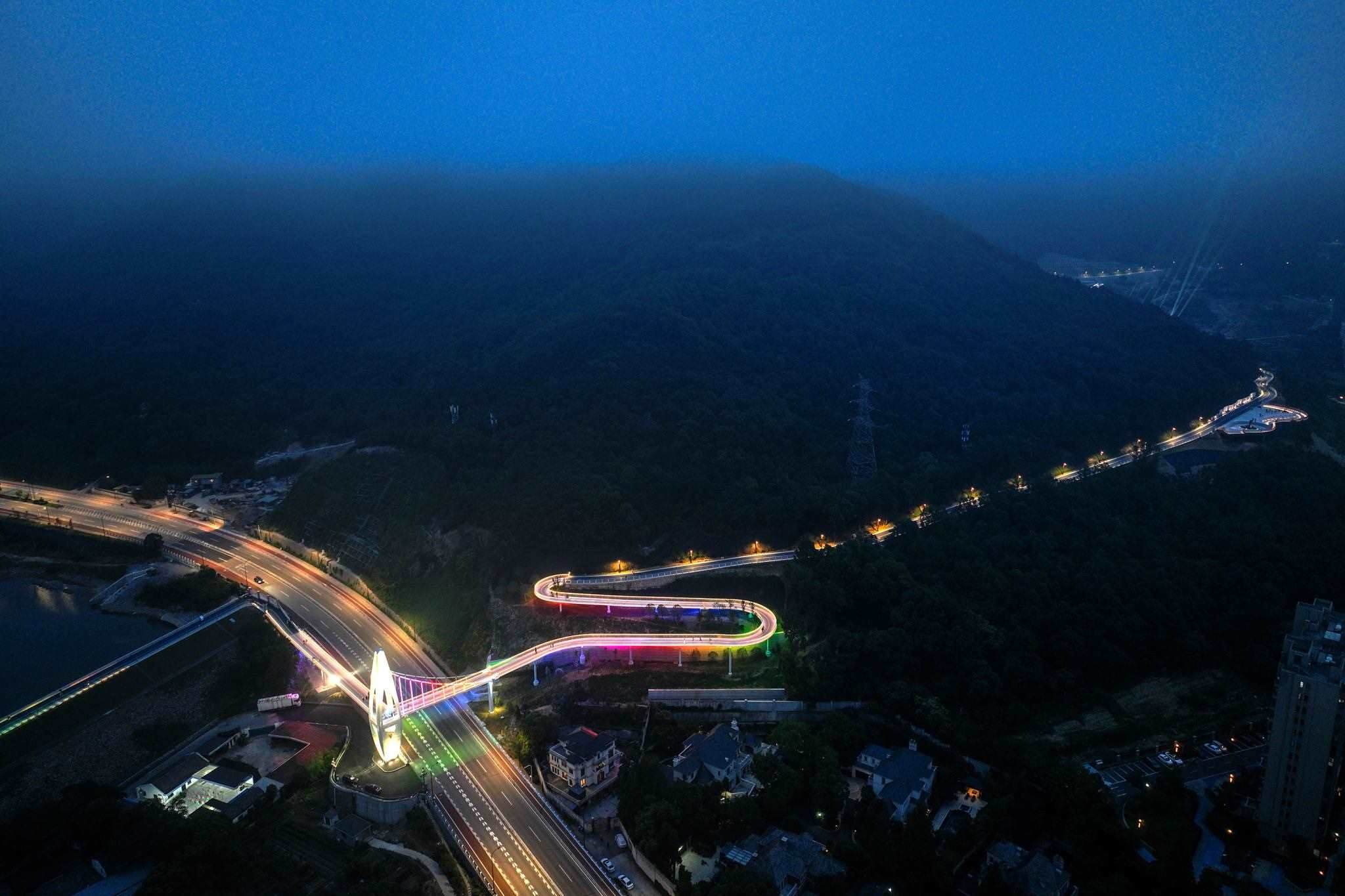 2023年5月26日,浙江舟山,定海區(qū)東海云廊的便道燈準(zhǔn)時亮起,使這條青山疊翠、美麗磅礴的東海云廊更為靚麗,似蛟龍遨游在蒼翠間。