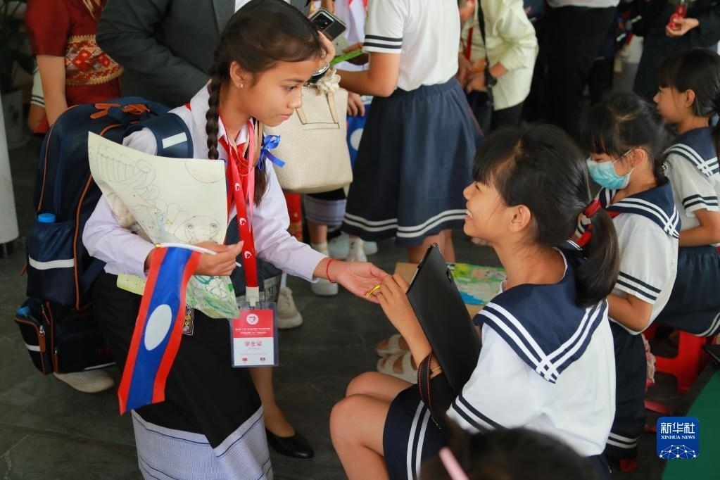 5月24日,在西雙版納州允景洪小學(xué),中老學(xué)生交換禮物。