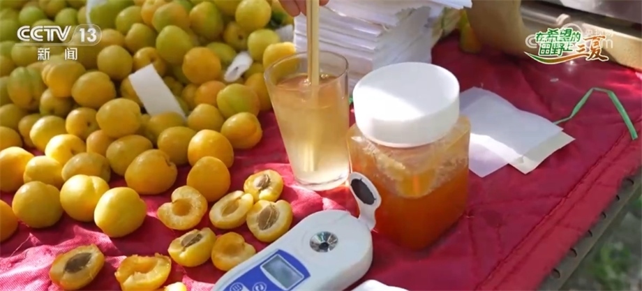 其實(shí)輪臺(tái)白杏在新疆本地也是非常有口碑的。大家知道嗎?輪臺(tái)白杏在當(dāng)?shù)匾脖环Q作是“白色蜂蜜”,那它到底擔(dān)不擔(dān)得起這個(gè)稱號(hào)?我們今天在現(xiàn)場(chǎng)給大家?guī)?lái)了一個(gè)小的試驗(yàn),這是一杯白水加了三勺蜂蜜,可以看到它已經(jīng)是蜂蜜水的顏色了,我們通過(guò)測(cè)糖儀來(lái)測(cè)一下蜂蜜水的糖度,17度。那我們來(lái)測(cè)一下我們剛才嘗的這個(gè)輪臺(tái)白杏,擠一些它的汁液出來(lái),16度,已經(jīng)非常接近蜂蜜水的甜度了。