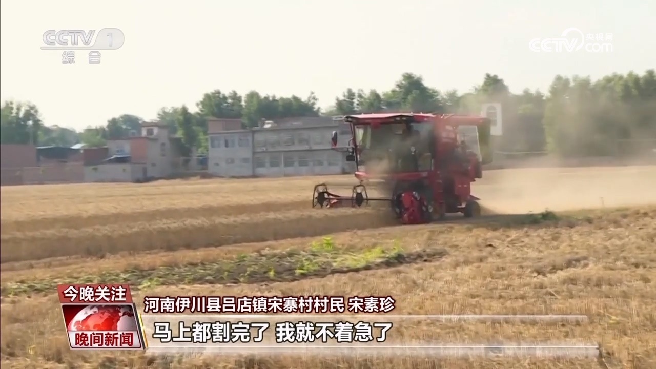 伊川縣呂店鎮(zhèn)宋寨村村民 宋素珍:前幾天下雨小麥?zhǔn)詹换貋?,心里可心慌,鄉(xiāng)里派履帶式收割機(jī),我這十幾畝地馬上都挨住(輪到)了,馬上都割完了,我就不著急了。