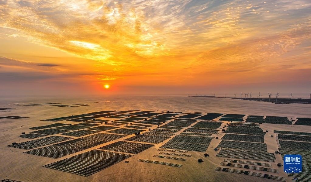 6月5日拍攝的朝霞映襯下的榮成市石島管理區(qū)桑溝灣海洋牧場生態(tài)網(wǎng)箱養(yǎng)殖區(qū)(無人機(jī)照片)。
