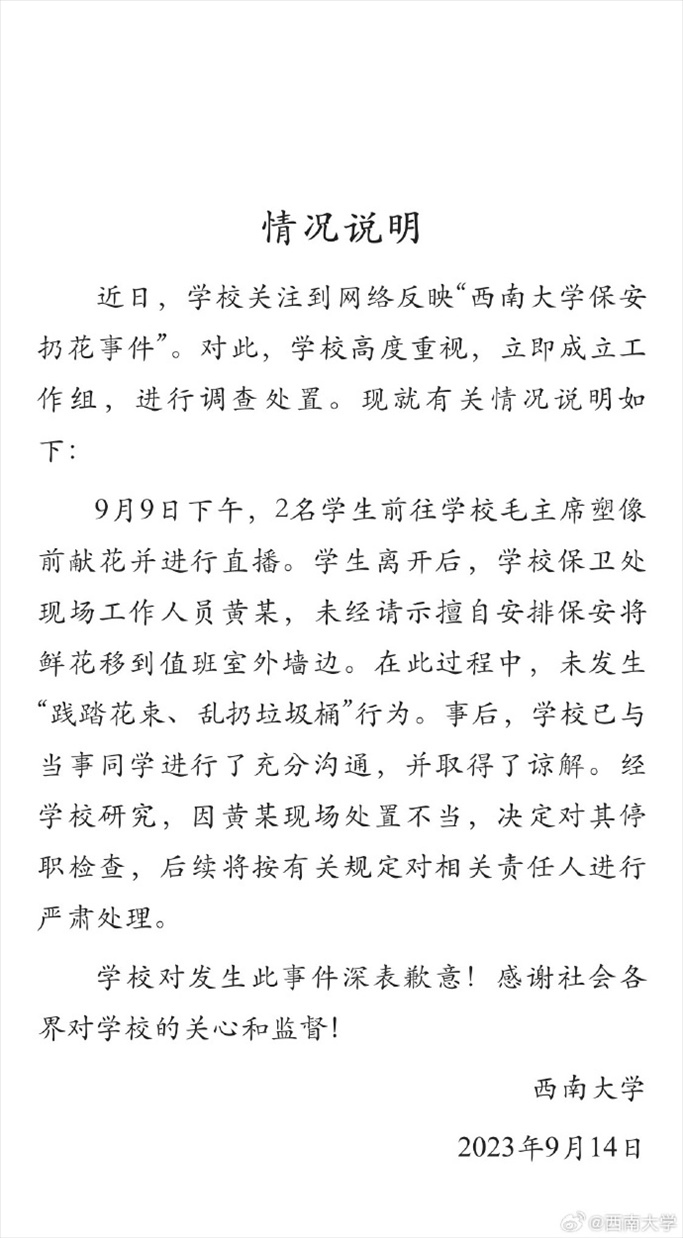 ·西南大學(xué)通報(bào)“保安扔花事件”:工作人員處置不當(dāng),決定對(duì)其停職檢查。