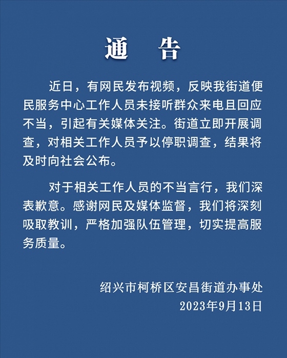 ·浙江紹興有市民發(fā)視頻稱,打不通安昌便民中心電話,來到現(xiàn)場發(fā)現(xiàn)工作人員都在聊天,吐槽電話是擺設(shè)。官方通報(bào):相關(guān)工作人員停職調(diào)查。