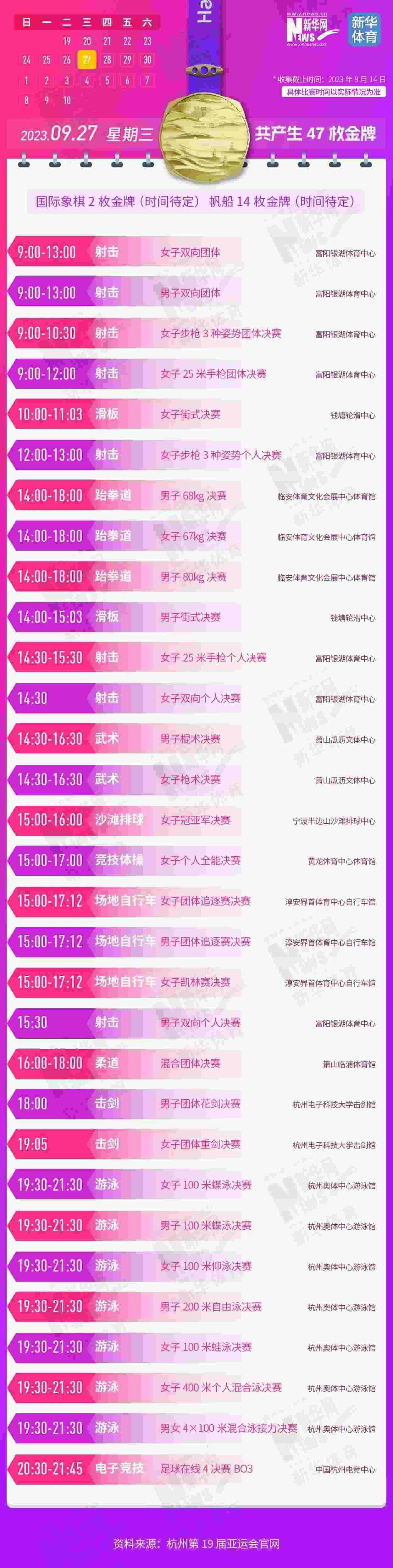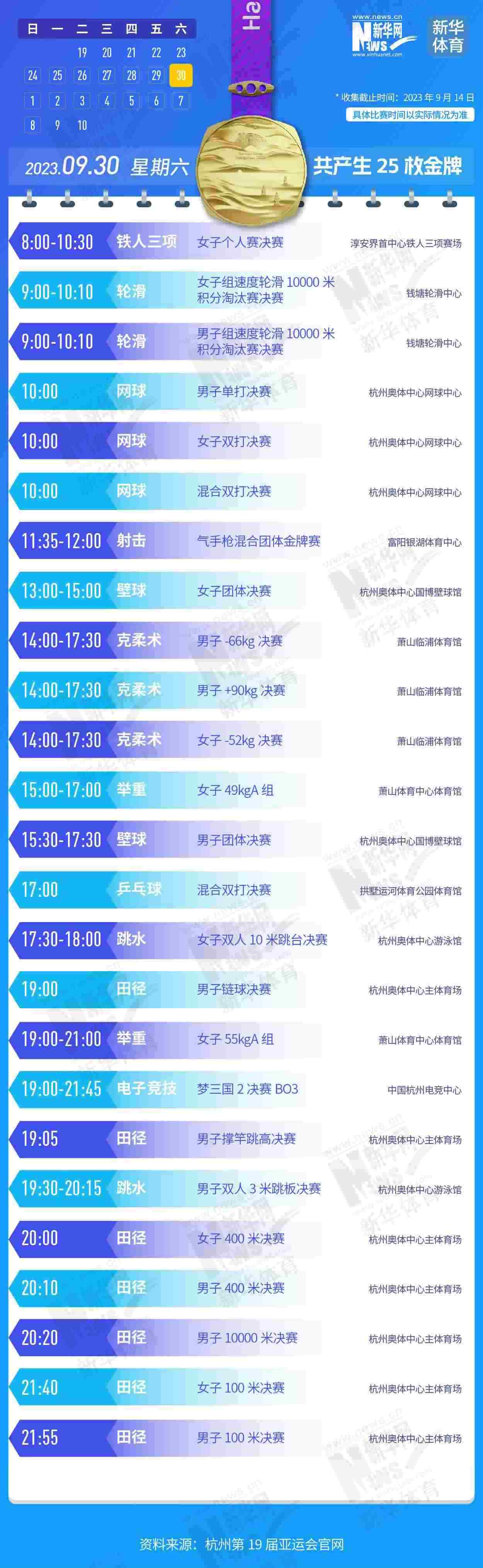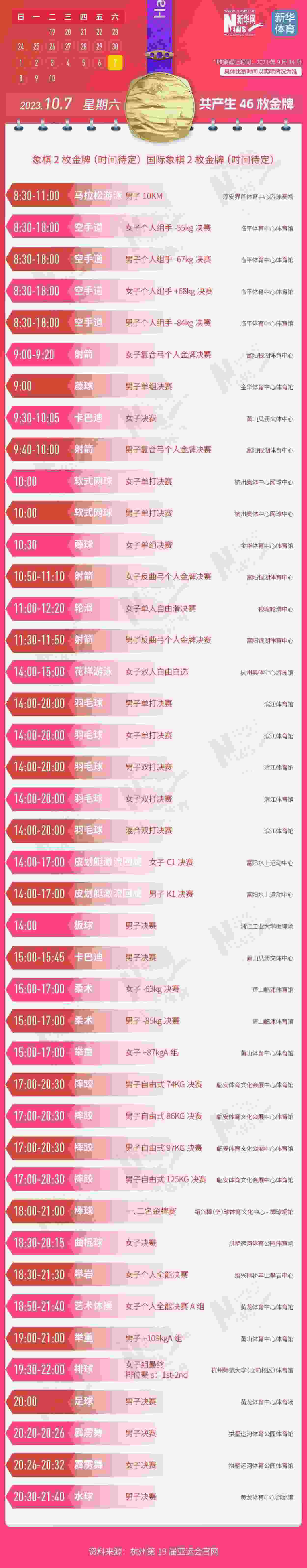 杭州第19屆亞運(yùn)會(huì)即將開(kāi)幕。本屆亞運(yùn)會(huì)將產(chǎn)生481枚金牌,快收藏這份金牌賽事日歷,助你精準(zhǔn)觀賽!