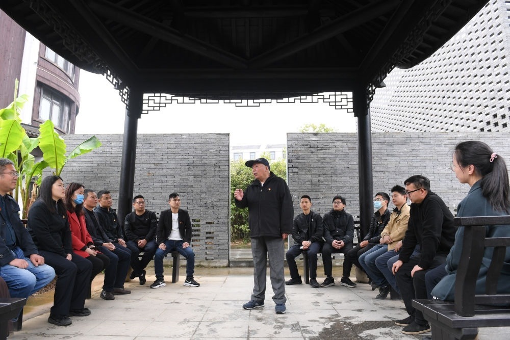 浙江紹興諸暨市楓橋鎮(zhèn)魏廉村老黨員魏杏根(中)在楓橋經(jīng)驗(yàn)陳列館的亭子內(nèi)和年輕黨員分享當(dāng)年運(yùn)用“楓橋經(jīng)驗(yàn)”化解基層矛盾的故事(2021年4月11日攝)。