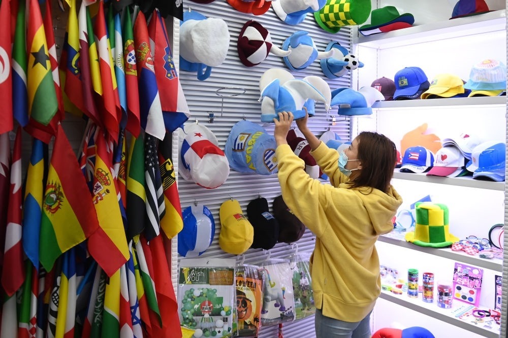 ↑2022年11月17日在義烏國(guó)際商貿(mào)城,一家獲得官方授權(quán)的商戶在展示2022卡塔爾世界杯參賽國(guó)家旗幟與周邊產(chǎn)品。