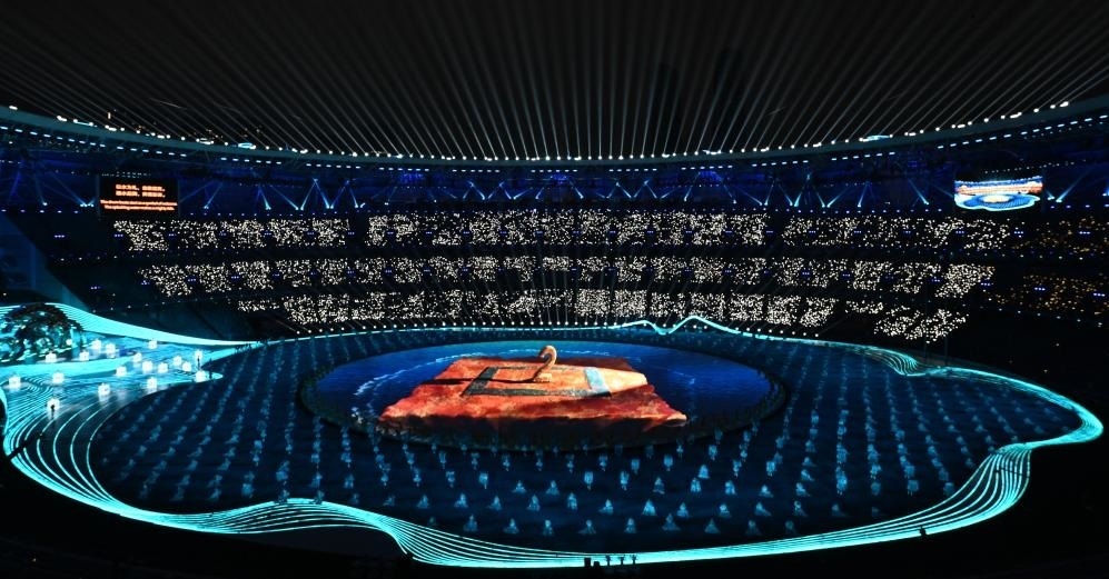 開幕式實(shí)現(xiàn)了兩個(gè)首創(chuàng):3D雙威亞首次應(yīng)用于大型運(yùn)動(dòng)場(chǎng),首次采用“數(shù)實(shí)融合”的點(diǎn)火方式。
