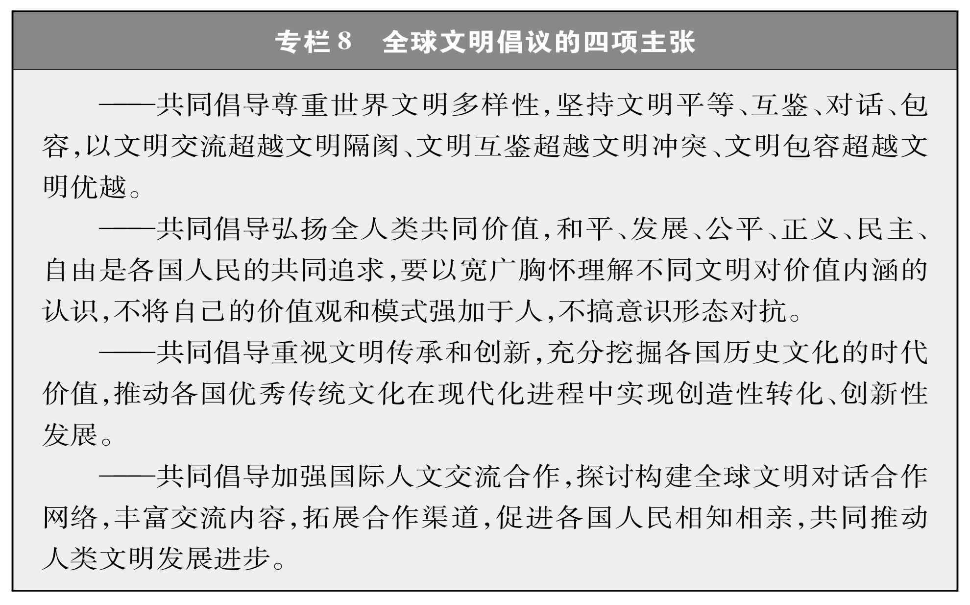 ——中國提出全球文明倡議,共同倡導(dǎo)尊重世界文明多樣性,共同倡導(dǎo)弘揚(yáng)全人類共同價(jià)值,共同倡導(dǎo)重視文明傳承和創(chuàng)新,共同倡導(dǎo)加強(qiáng)國際人文交流合作。全球文明倡議向全世界發(fā)出增進(jìn)文明交流對話、在包容互鑒中促進(jìn)人類文明進(jìn)步的真摯呼吁,為推動(dòng)構(gòu)建人類命運(yùn)共同體注入了精神動(dòng)力。