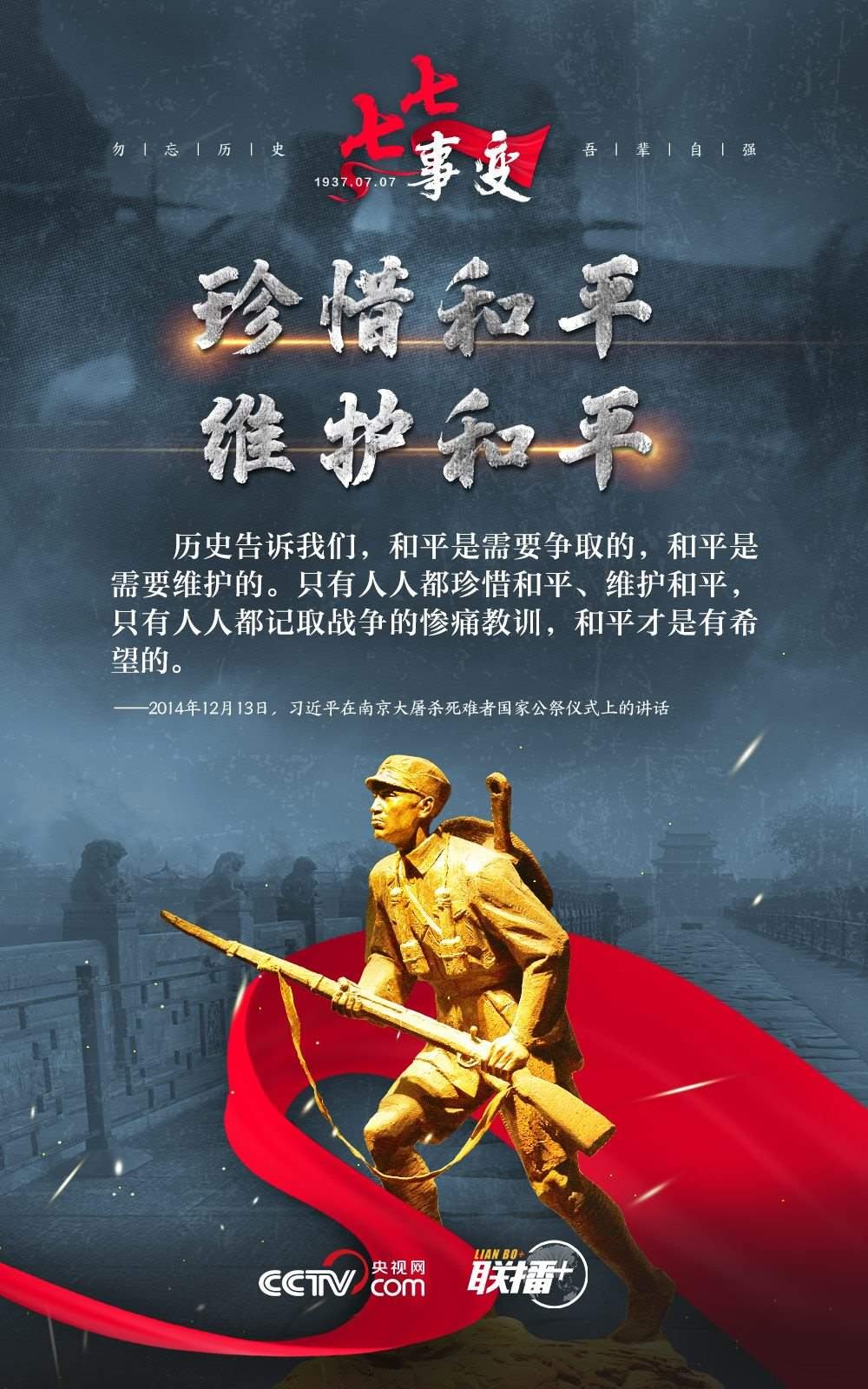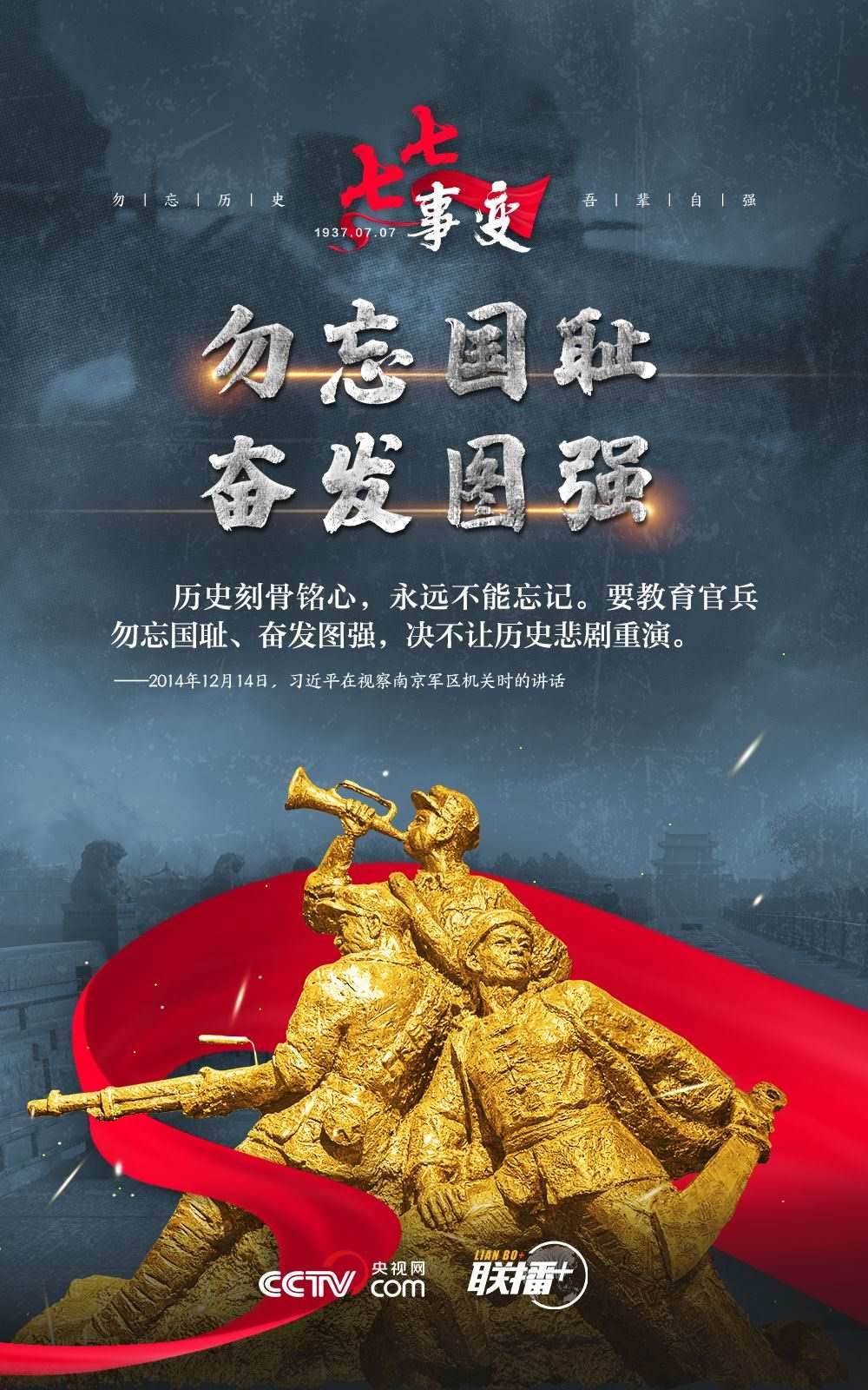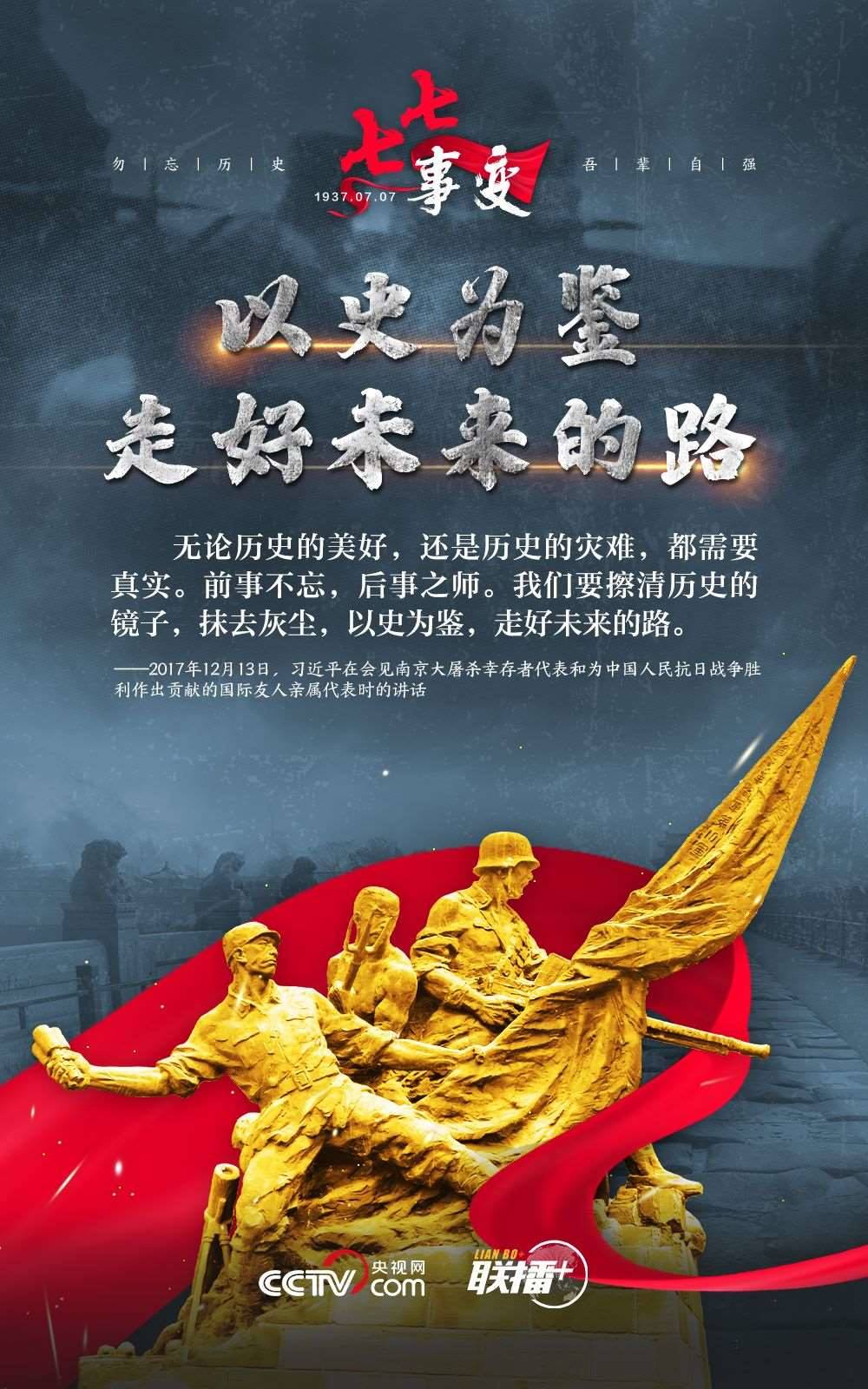 悼念同胞,緬懷先烈。勿忘歷史,吾輩自強(qiáng)!在“七七事變”86周年之際,央視網(wǎng)《聯(lián)播+》欄目特推出海報(bào),與您一起從總書(shū)記講話中汲取自強(qiáng)不息的奮進(jìn)力量。