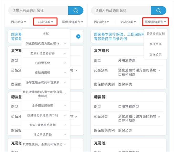 也可以根據(jù)自己的需求,選擇“藥品分類”或“醫(yī)保報銷類別”進(jìn)行篩選。
