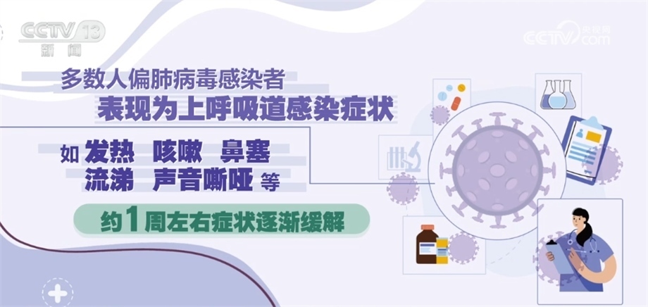 《人偏肺病毒感染診療方案(2023年版)》指出,人偏肺病毒感染者是主要傳染源。從潛伏期末到急性期都有傳染性。主要通過飛沫和密切接觸傳播,也可以通過接觸被病毒污染的物品間接傳播。人偏肺病毒人群普遍易感,在5歲以下兒童、老年人和免疫功能低下的人群中更為多見,潛伏期為3天—9天,多為3天—6天。多數人偏肺病毒感染者表現(xiàn)為上呼吸道感染癥狀,如發(fā)熱、咳嗽、鼻塞、流涕、聲音嘶啞等,約1周左右癥狀逐漸緩解。鑒于目前尚無證據證明有對人偏肺病毒有效的特異性抗病毒藥物,不建議使用抗病毒藥物進行治療。避免盲目或不恰當使用抗菌藥物,尤其是聯(lián)合使用廣譜抗菌藥物。