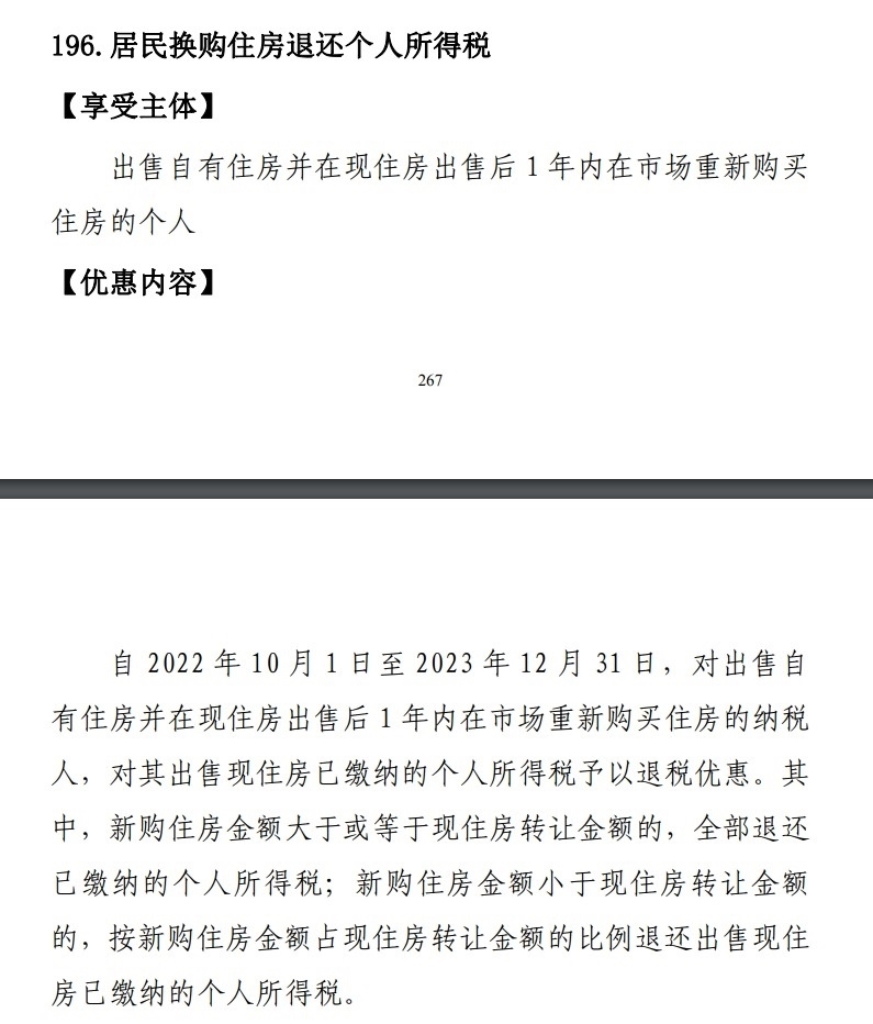 居民換購(gòu)住房退還個(gè)人所得稅政策也已于2022年發(fā)布。按照規(guī)定,自2022年10月1日至2023年12月31日,對(duì)出售自有住房并在現(xiàn)住房出售后1年內(nèi)在市場(chǎng)重新購(gòu)買(mǎi)住房的納稅人,對(duì)其出售現(xiàn)住房已繳納的個(gè)人所得稅予以退稅優(yōu)惠。其中,新購(gòu)住房金額大于或等于現(xiàn)住房轉(zhuǎn)讓金額的,全部退還已繳納的個(gè)人所得稅;新購(gòu)住房金額小于現(xiàn)住房轉(zhuǎn)讓金額的,按新購(gòu)住房金額占現(xiàn)住房轉(zhuǎn)讓金額的比例退還出售現(xiàn)住房已繳納的個(gè)人所得稅。