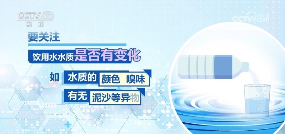要關(guān)注飲用水水質(zhì)是否有變化,如水質(zhì)的顏色、嗅味,有無泥沙等異物,如有異常,切勿飲用。