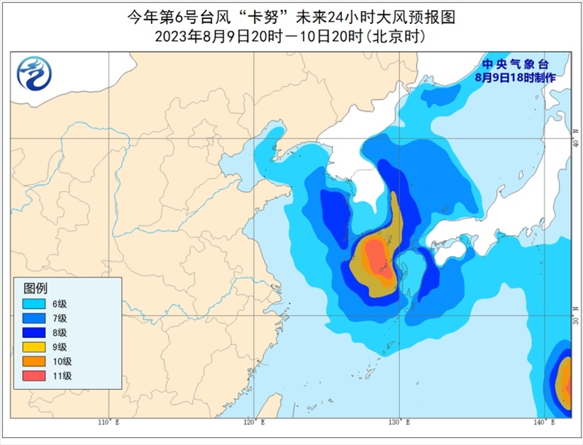 9日20時至10日20時,渤海東部、渤海海峽、黃海大部海域、東海東部海域?qū)⒂?-7級、陣風(fēng)8-9級的大風(fēng),其中黃海中部和南部偏東海域、東海東北部偏東海域風(fēng)力可達(dá)8-9級,“卡努”中心經(jīng)過的附近海域風(fēng)力可達(dá)10-11級、陣風(fēng)12-13級;遼東半島沿岸也將有5-6級大風(fēng),陣風(fēng)可達(dá)7-8級。