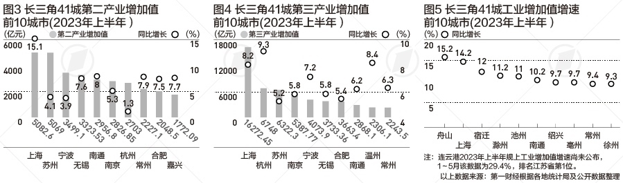除上海外,還有七市GDP超過5000億元,江蘇有4市,分別是蘇州、南京、無錫、南通;浙江為杭州、寧波;安徽為合肥。