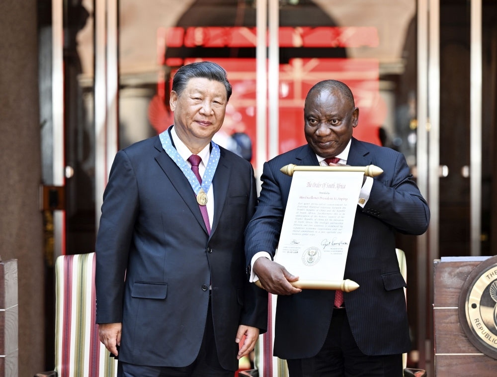 會談后,拉馬福薩向習近平授予“南非勛章”,這是南非授予重要友好國家元首的最高級別勛章和最高榮譽。