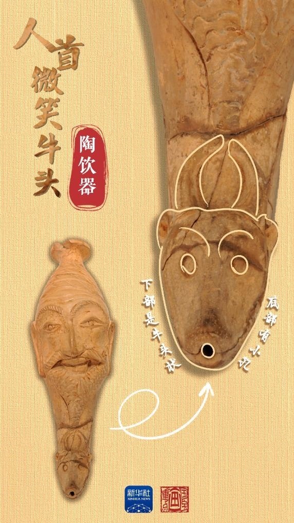 當中國絲綢的美譽經(jīng)由古絲綢之路在西亞、歐洲等地傳揚時,西方文明也穿過風沙與長歌,在中國留下了印記。人首微笑牛頭陶飲器出土于和田地區(qū)約特干遺址,為唐代時期文物。飲器上部為人首形,下部是牛頭狀,底部帶小圓孔,上下兩部分內(nèi)腔相通。人首上唇胡須外展卷翹,面帶微笑。牛頭微微上翹,牛角豎立攏圓。這種飲器造型源自“來通”,即末端為動物形或人首形的角杯,是小亞細亞和地中海地區(qū)常見的飲酒器具,絲綢之路沿線國家都有類似文物出土。