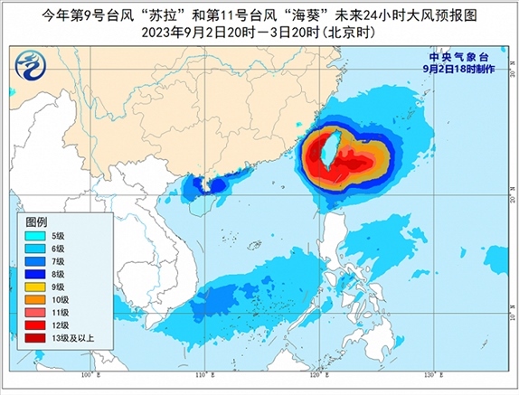 大風預(yù)報:9月2日20時至3日20時,受“蘇拉”影響,廣東中西部沿海、廣西南部沿海、海南島北部沿海、珠江口及澳門等地將有6-7級大風,南海西北部、北部灣東部和瓊州海峽將有8級、陣風9-10級的大風;受“??庇绊?,巴士海峽南部、臺灣海峽西部、東海南部及釣魚島附近海域、浙江南部沿海、福建中北部沿海、臺灣島沿海將有6-8級、陣風9-10級大風,巴士海峽北部、臺灣海峽東部、臺灣以東洋面及臺灣島南部沿海的風力有9-12級,陣風13-14級,“??敝行慕?jīng)過的附近海面或地區(qū)的風力有13-16級,陣風17級。