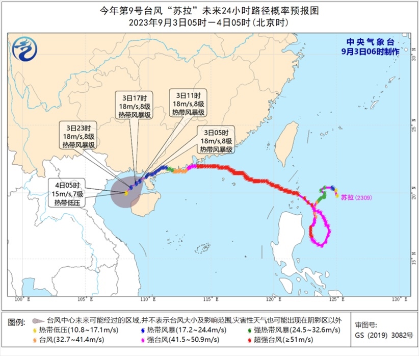 降水預報:9月3日08時至4日08時,受“蘇拉”和“??庇绊?,廣西中南部、廣東西南部、臺灣島等地部分地區(qū)有大到暴雨,其中,廣西中南部、臺灣島中東部等地部分地區(qū)有大暴雨,臺灣島東部部分地區(qū)有特大暴雨(250-600毫米)。