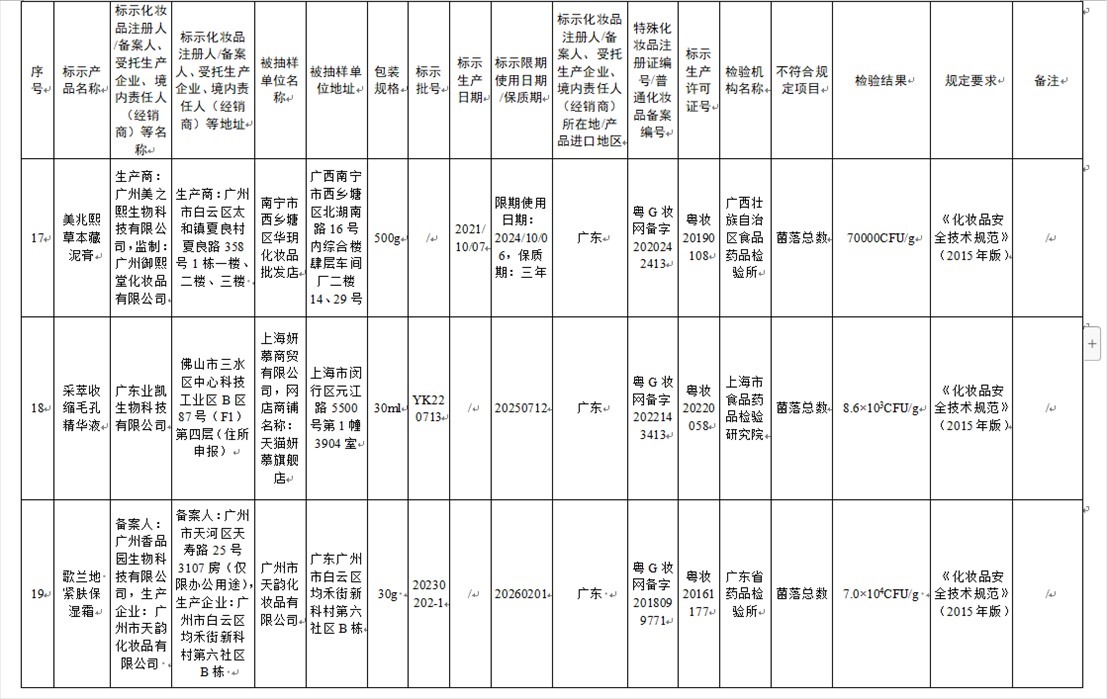 國家藥監(jiān)局網(wǎng)站今天發(fā)布通告稱,在2023年國家化妝品抽樣檢驗工作中,經(jīng)重慶市食品藥品檢驗檢測研究院等單位檢驗,產(chǎn)品標簽標示為廣州市天科化妝品有限公司生產(chǎn)的天科染發(fā)膏(自然黑)等23批次化妝品不符合規(guī)定(見下圖表格)。