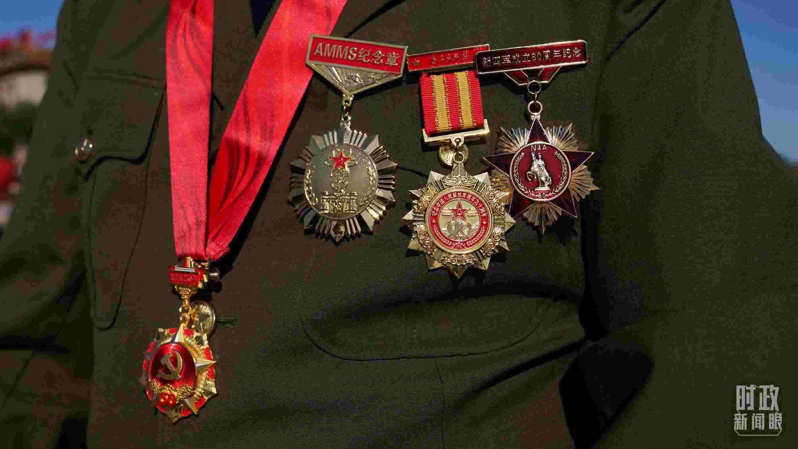 △儀式現(xiàn)場,老戰(zhàn)士代表身上佩戴多枚紀(jì)念章。(總臺(tái)國廣記者李晉拍攝)