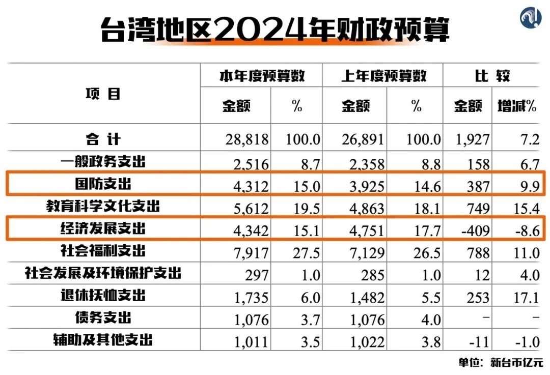 民進黨當局不久前通過的2024年財政預算案就很能說明問題。各項支出中,防務支出繼續(xù)保持增長,經濟發(fā)展支出卻是所有領域中跌幅最大的。