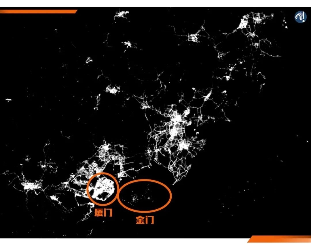 這是福建周邊的夜光遙感地圖??梢钥吹?,就在廈門被點亮的時候,金門卻是一片漆黑。與此同時,金門的發(fā)展也有個特點,那就是靠近大陸的地方更亮。