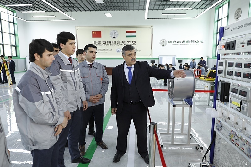 2023年4月12日,在塔吉克斯坦首都杜尚別的魯班工坊內(nèi),塔方教授向?qū)W生講解綠色電能展示平臺(tái)的功能與使用方法。