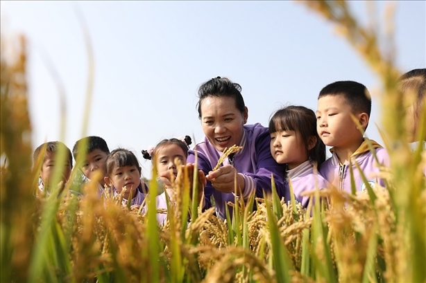10月16日, 世界糧食日。山東臨沂沂南縣大莊鎮(zhèn),小朋友在稻田聽老師講解水稻種植知識(shí)。