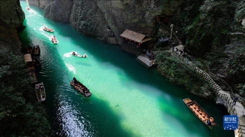 秋日,湖北省恩施土家族苗族自治州鶴峰縣容美鎮(zhèn)屏山村屏山旅游景區(qū)吸引眾多游客。屏山旅游景區(qū)河水清澈見底,舟行水上如懸浮空中,美如畫卷。