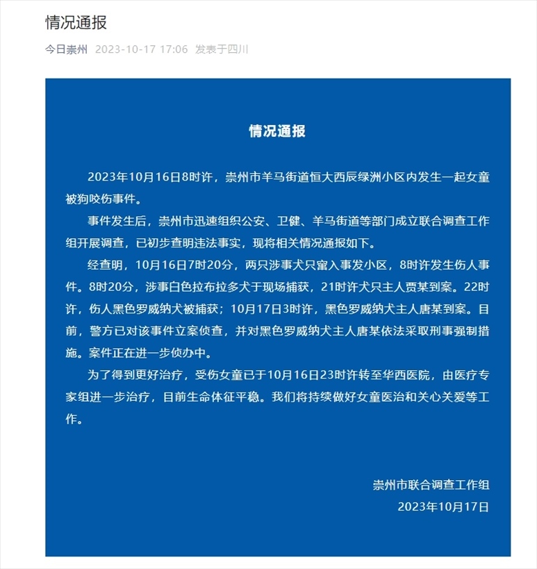 ·四川崇州通報(bào)女孩被狗咬傷:羅威納犬主人被采取刑事強(qiáng)制措施。