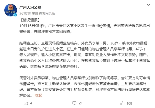 ·廣州警方通報(bào)小區(qū)保安將外賣員按地上毆打:雙方均主動(dòng)承認(rèn)錯(cuò)誤,已達(dá)成和解協(xié)議。