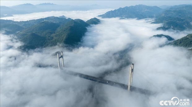 2023年10月16日,湖北恩施土家族苗族自治州,貢水河大橋云霧繚繞,宛若仙境。