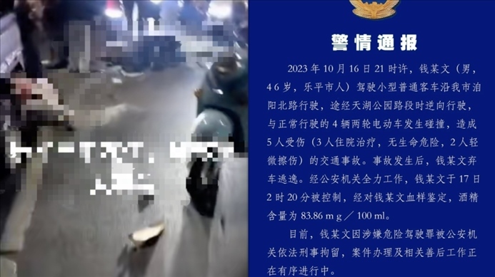 ·江西樂平警方:醉駕逆行撞傷5人后逃逸男子被刑拘。