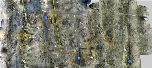 經(jīng)過調(diào)查,探明了一號、二號沉船遺址的分布范圍,在二處遺址核心堆積區(qū)的西南角布放水下測繪永久基點,完成了遺址三維激光掃描和一號沉船遺址核心區(qū)、環(huán)形散落區(qū)、部分條形散落區(qū)和二號沉船遺址核心區(qū)、散落區(qū)的攝影拼接,從一號沉船遺址提取出水文物標本543件(套),二號沉船遺址提取出水遺物36件。