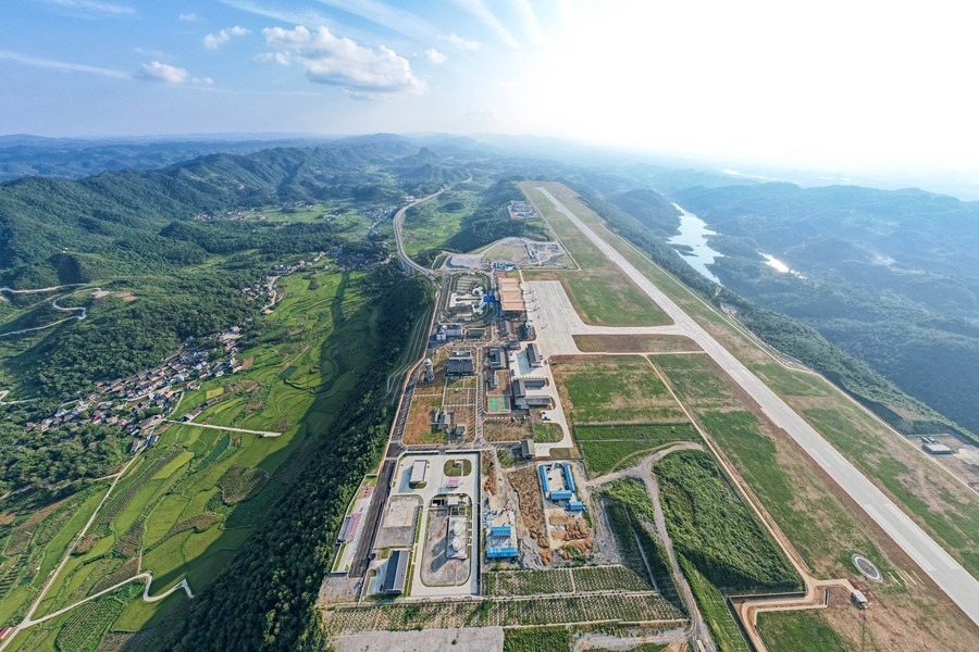 這是8月17日在湖南省湘西土家族苗族自治州花垣縣花垣鎮(zhèn)老天坪村拍攝的湘西邊城機(jī)場(chǎng)(無(wú)人機(jī)照片)。新華社記者 陳思汗 攝