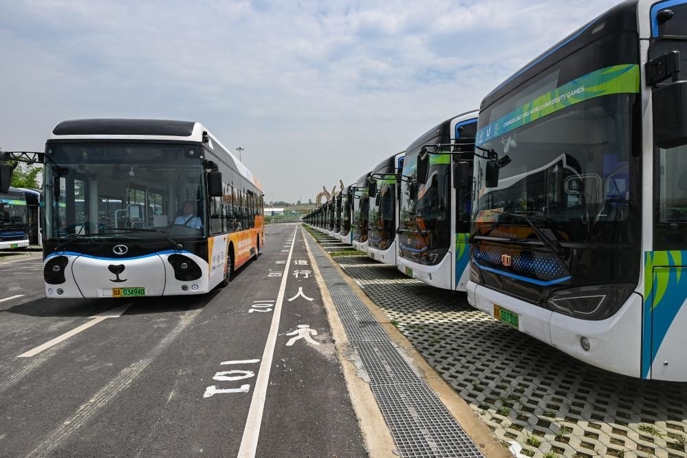 這是負責(zé)成都第31屆世界大學(xué)生夏季運動會交通保障的新能源公交車。新華社記者王曦 攝