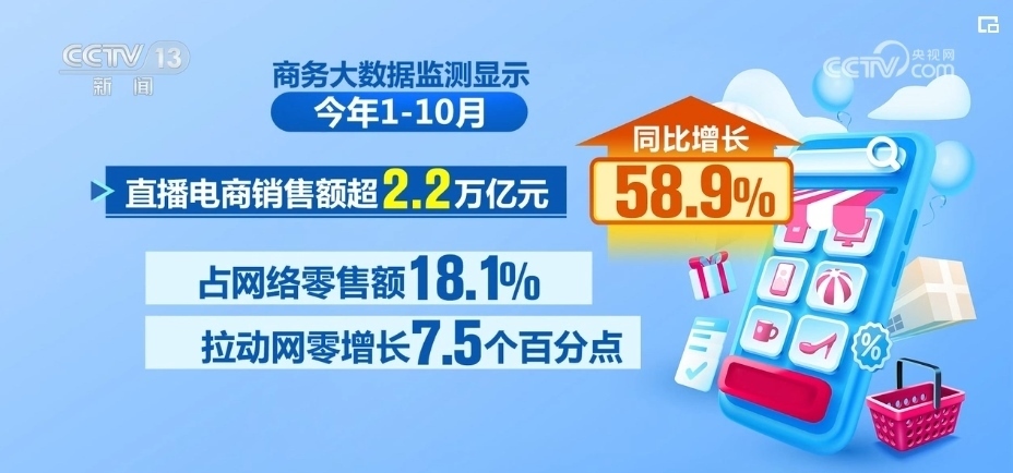 商務大數(shù)據(jù)監(jiān)測顯示,2023年1—10月份,直播電商銷售額超2.2萬億元,同比增長58.9%,占網絡零售額18.1%,拉動網零增長7.5個百分點。其中,中秋、國慶期間,住宿、旅游、文娛和餐飲日均在線銷售額同比分別增長133.7%、123.1%、82.1%和19.7%。
